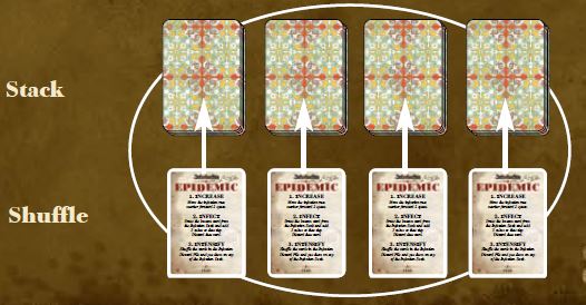 Shuffle 1 Epidemic card into each pile, face down. Stack these piles to form the Player Deck, placing smaller piles on the bottom.