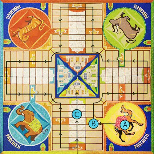 Each pawn must enter home by exact die roll, counting the HOME square as a space. For example, the Yellow player's pawn on space C in the gameboard diagram is 3 spaces away from HOME.