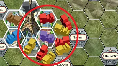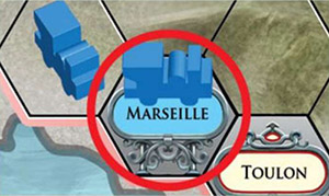 One locomotive per color is placed in each one of the six start hexes surrounding the Eiffel tower hex.