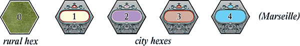 A rural hex may contain a maximum of two locomotives (of different colors). A city hex may contain only one locomotive.