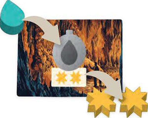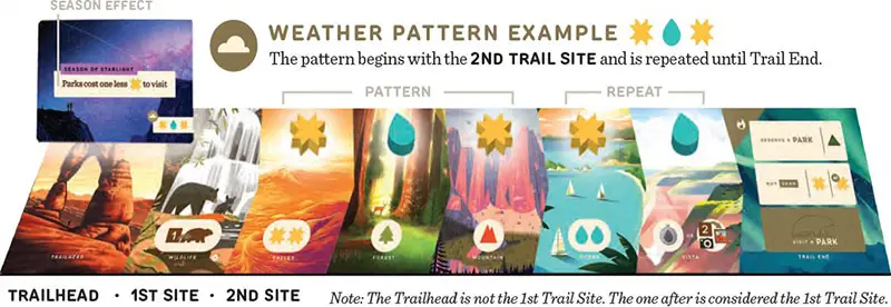 weather pattern displayed on the bottom right of the card. Starting with the 2nd Trail Site, place the indicated tokens from the Weather Pattern onto the Trail-one per Site-from left to right. Simply repeat this pattern down the Trail and stop at the Trail End. You're ready to begin!