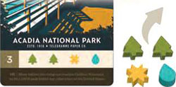 Take the Park card and place it vertically in your score area. The points denoted on the Park card will be scored at the end of the game. Parks can be stacked showing their resources and points. Whenever a Park is visited on the board, reveal a new Park from the Parks deck into the empty slot.