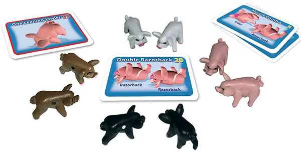 Important: A player must leave one of his pigs on the table if its pose is included on the roll. Thereafter, he only rolls the pig that doesn't match. +Note: a few cards require only ONE pig to score. If you are first to roll it, you win the card.