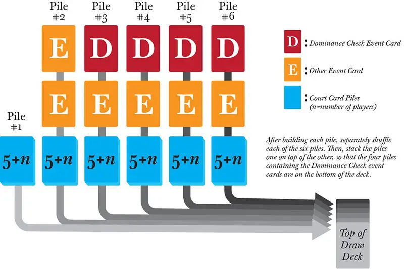 Finally, separately shuffle each of the six piles. Then, stack the piles one on top of the other, so that the four piles containing the Dominance Check event cards are on the bottom of the deck. Do not shuffle this combined deck.