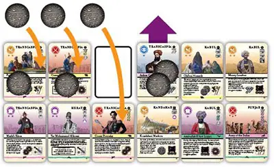 Because he already placed a coin on each of the first two cards in the top row this turn, he cannot purchase them. He decides to purchase the card "Arthur Conolly". He pays a coin to the first two cards in the top row. Because the third slot is vacant, he pays his third coin to the opposite row.