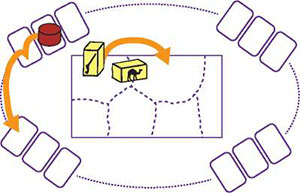 Spies move along cards in the players' courts (clockwise or counter-clockwise), as if they formed a single continuous track around the area of play.