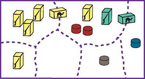 During setup, create this market by drawing cards from the draw deck and filling each market column (top row first), starting with the leftmost column. Then place the draw deck to the right of the market.