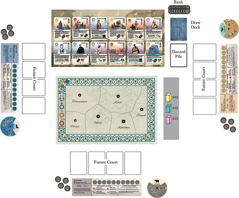 Give each player a set of eleven cylinders, one loyalty dial, a player board, and four rupees. Place one cylinder from each player on the zero space of the victory point track and the rest on each player's player board.