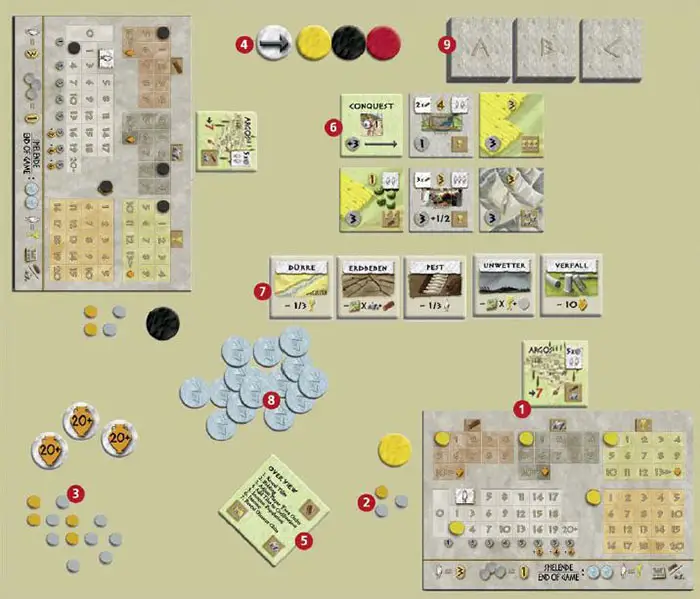 The 7 Civilization Tiles are mixed face-down and one is dealt to each player, which he places face-up above his Player Mat. Extra tiles are placed back in the box. Each player takes as many coins as the starting income on his Civilization Tile (upper right corner) and places these beside his Mat. 2