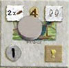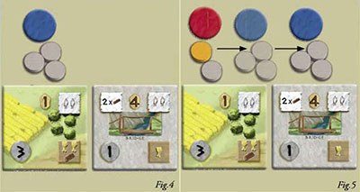 He takes any number of coins from his supply and places them, along with his other Colored Chit, under the tile he wishes to purchase (Fig. 4).