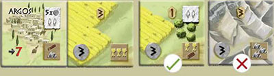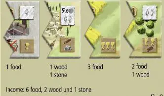 Not every Land Tile, however, is allowed to be placed next to every other Land Tile. Neighbouring Land Tiles must always have at least one resource - wood, food or stone (lower right corner) - in common.