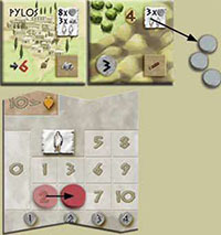 With the help of Possession Markers, the Player Mats show all current possessions of that players civilization. Each player has a storehouse for wood, stone and food. In addition the total population and the number of the luxury goods are indicated. As soon as the possessions of a player changes, the appropriate track is adjusted. At the bottom of the Mat, there is also an overview of the events that take place at the end of the game.