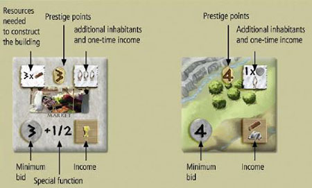 Then a new round is begun, five new Land/Building Tiles are draw and placed face- up, and the starting player makes the first bid.