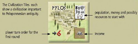 Peloponnese - seat of the Gods. Each player represents one of 7 Peloponnesian civiliza- tions in 1000 B.C., trying to develop it, increase its wealth and population, and become the most powerful entering the new millennium.