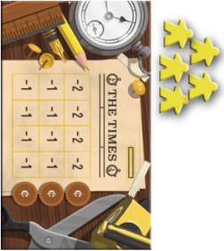 The large central arrow on the arrow marker now points to the value of the news beat, while the smaller, S-shaped arrow points to the scoop value of the beat. The arrow markers can never be pushed above their maximum value of 6, regardless of placement of additional reporters.