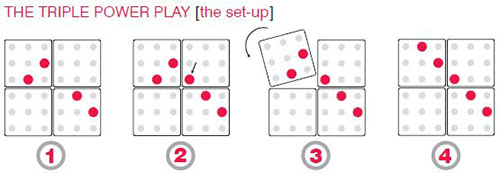 Below is a step-by-step guide of examples to set-up each of the four winning plays. There are many ways to build towards each formation, though we've just shown one example of each play below, except in the Triple Power Play, which is so verstaile that it cannot adequately be illustrated with just one example.