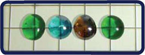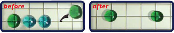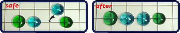 The bracketing stones must be of one color. In the diagram below Green captures a Blue and Amber stone.