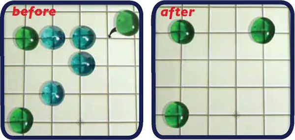 As soon as the capturing play is made, the captured stones are removed from the grid and placed in view along the border so that both players can see how many stones have been taken.