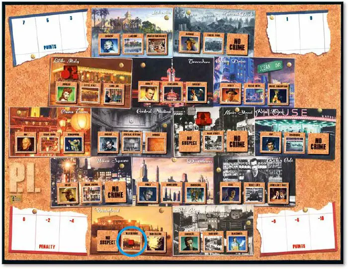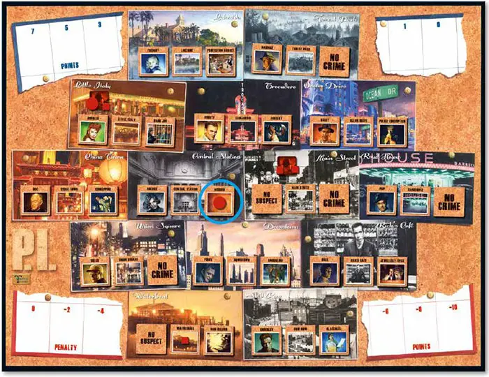 Example: In her next turn Red selects the Murder evidence card. This results in a disc being placed on the tile. This tells her that Bubbles must be responsible, as the disc in Little Italy cannot be connected to the location tile (ruled out by the presence of a cube on the Waterfront tile).