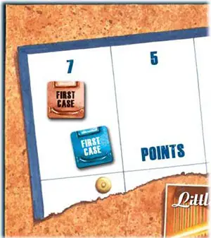After that when a player solves their case they place their Points counter in the next empty box down, i.e. the second player to solve their case will score five points.