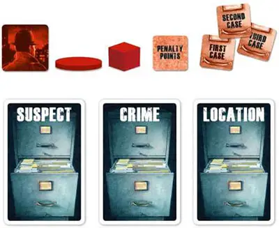 You take the three black discs and indicate who you think the suspect is, the crime they committed, and where they are hiding out, by placing them on the corresponding tiles. The player to your right must now declare whether you are correct or not.