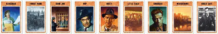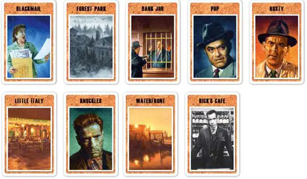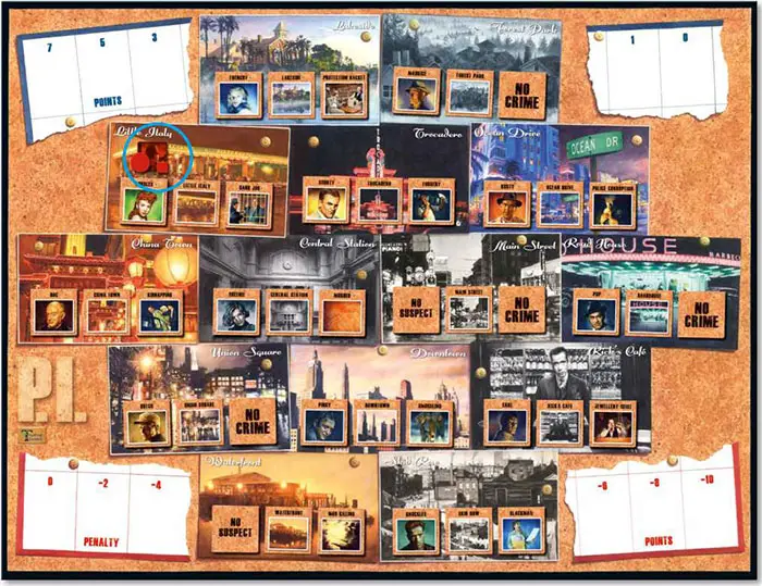 Example: Red places an Investigator counter in Little Italy. The player to her right examines the Case cards that he holds.