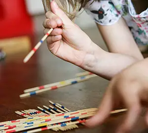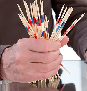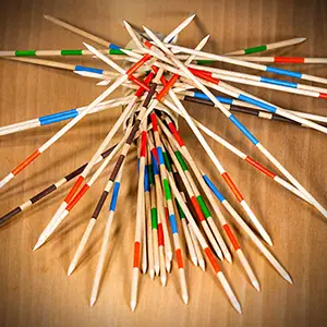 Pick up the sticks, one by one; by tipping the pointed end or in any other manner; all Is fair if no other stick than the one you tackle moves.