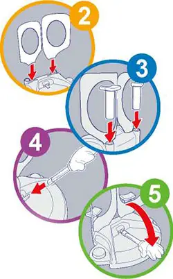 Insert the chin rests into the slots on the pie thrower as shown. The chin rests will help secure the two masks. Be careful not to bend the masks.