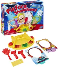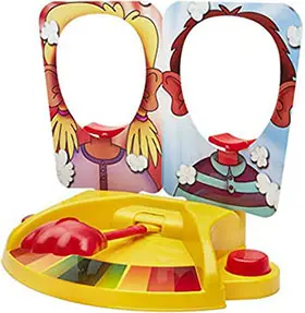 When the hand gets too close to your opponent's side of the pie thrower, it'll spring up, and that player will get "PIE-FACED!"