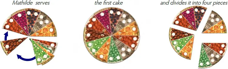 Then the next player to the left becomes the server and places the slices of the next cake and divides it. This continues until all 5 cakes have been served.