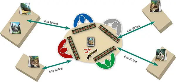 Stand the 2 targets (Space Penguin and Bear), the 2 Suspension Bridge bases and the Pirate Ship base in assorted locations 6 to 10 feet from where the game is set up, visible to all players.