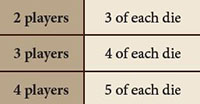 Put 1 set of dice (1 die of each color), plus 1 more set per player, into the dice bag.