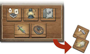 Mix the equipment tiles face down and stack on the General Store space on the board. Turn 1 face up, plus an additional 1 for each player in the game, to form an available supply in the space below the store.
