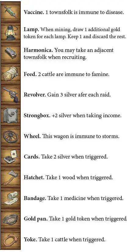 Remember: You can take equipment, gold, wood or medicine even if there are not enough free spaces in your wagons; but you must discard any items that you are not able to accommodate by the end of your turn (you can switch items around in your wagons freely at any time).