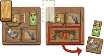 However, you may rearrange what is in each of your wagons before you discard. Each damage token on your wagons at the end of the game is worth -2 VP.