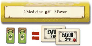 Medicine: Take 1 medicine and place it on a space in one of your wagons. Each wagon space can hold 2 medicine at a time.