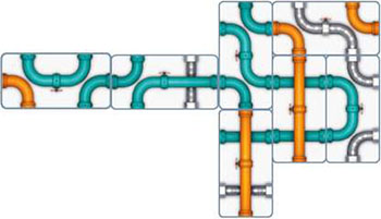 The colors of Pipelines do not need to match (you may connect a Teal Pipe segment to an Orange Pipe segment, for example). Pipe tiles may be rotated in any direction.