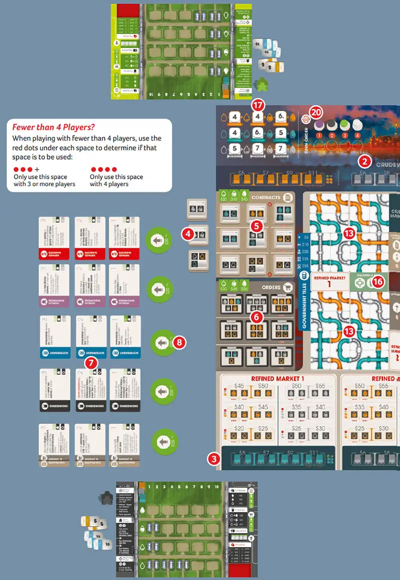2and the Crude rows of the Refined Markets3with the matching color of Oil barrels. Use the Market Overlay tiles to reduce the number of available spaces when playing with fewer than 4 players. -
