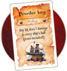 For the next volley only, rolls of 3, 4, 5 or 6 hit the enemy. Afterwards, your cannons receive 2 hits of damage. If this cripples your ship, you must retreat to Pirate's Cove.