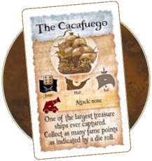 The Cacafuego is defenseless against attack. Player pirates battle each other to determine who can pilfer the great riches of this floating treasure chest, but don't know how much booty they are fighting until after the battle is won.