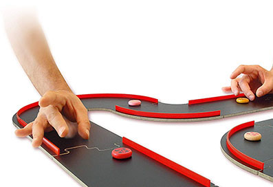 The cars must be moved by flicking. Any finger may be used. The players take turns. If your car flips or goes off the track, you must return your car to its original position.