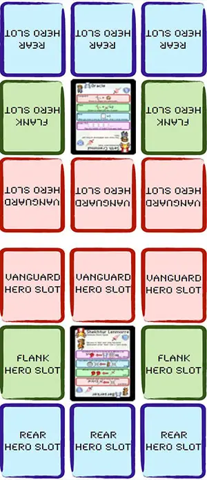 Example: Shekhtur only has a melee attack (like most leaders), so she can attack the closest hero in a column. In this case she could hit Seth, (the opposing leader), his Illusionist, or his Overlord. She would not be able to hit the Mystic, who is protected by the vanguard-row Illusionist.