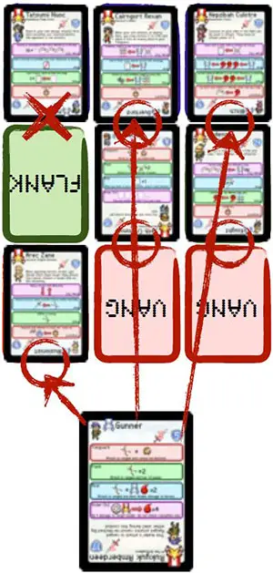Melee attacks can only be made by the frontmost card in a column. In this example, only the cards with O's are capable of declaring melee attacks. The others (who have X's) aren't positioned to perform melee attacks.