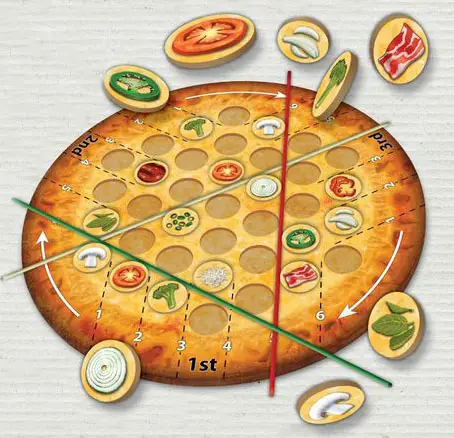 The first player rolls the die of the unselected color and places its Pizza Cutter on the board over the line that matches the resulting number, from the direction not used by either player.