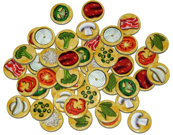 Tie breaker: If two players run out of toppings during the same round, whichever player would end with more toppings on the Pizza is the winner.