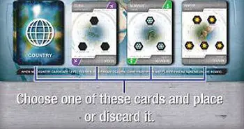 Either take one of the face-up Country Cards or draw an unknown one from the top of the Country Deck. Decide if you want to place it on the World Board or discard it and draw new Trait Cards.