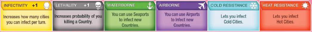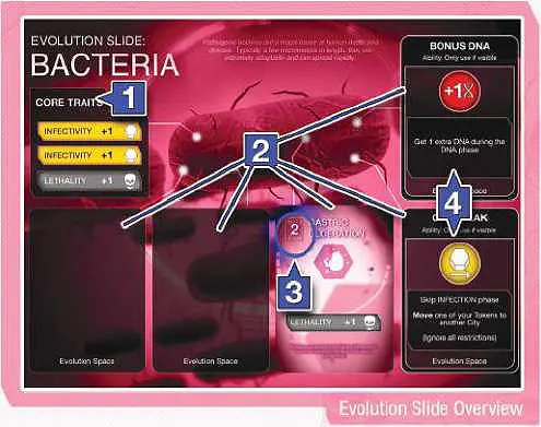 Your Evolution Slide displays the Traits that your disease currently has. Traits are represented by colored bars and change the way your disease behaves. You start the game with some Core Traits 1 on your Evolution Slide and five Trait Cards in your hand.