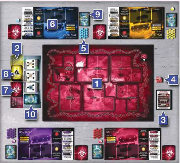 Give each player a set of 16 colored Plague Tokens ("Tokens") with a matching DNA Points Marker 5 and a Bacteria Evolution Slide. 6