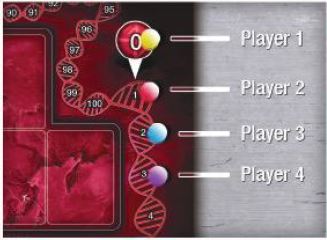Throughout the game, each time a player scores DNA Points, that player will advance their marker accordingly. When a player spends DNA Points - that player's marker is moved back along the track by the number of points spent.