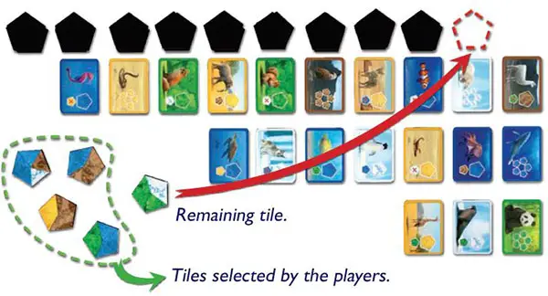 Once every player has selected a tile, place all the remaining tiles face down in the 11th spot in the Continent row. Once this pile has 5 tiles, place the remaining tiles from your rounds in the 12th spot. When this pile has 5 tiles, any aditionnal tiles are discarded and placed in the box.